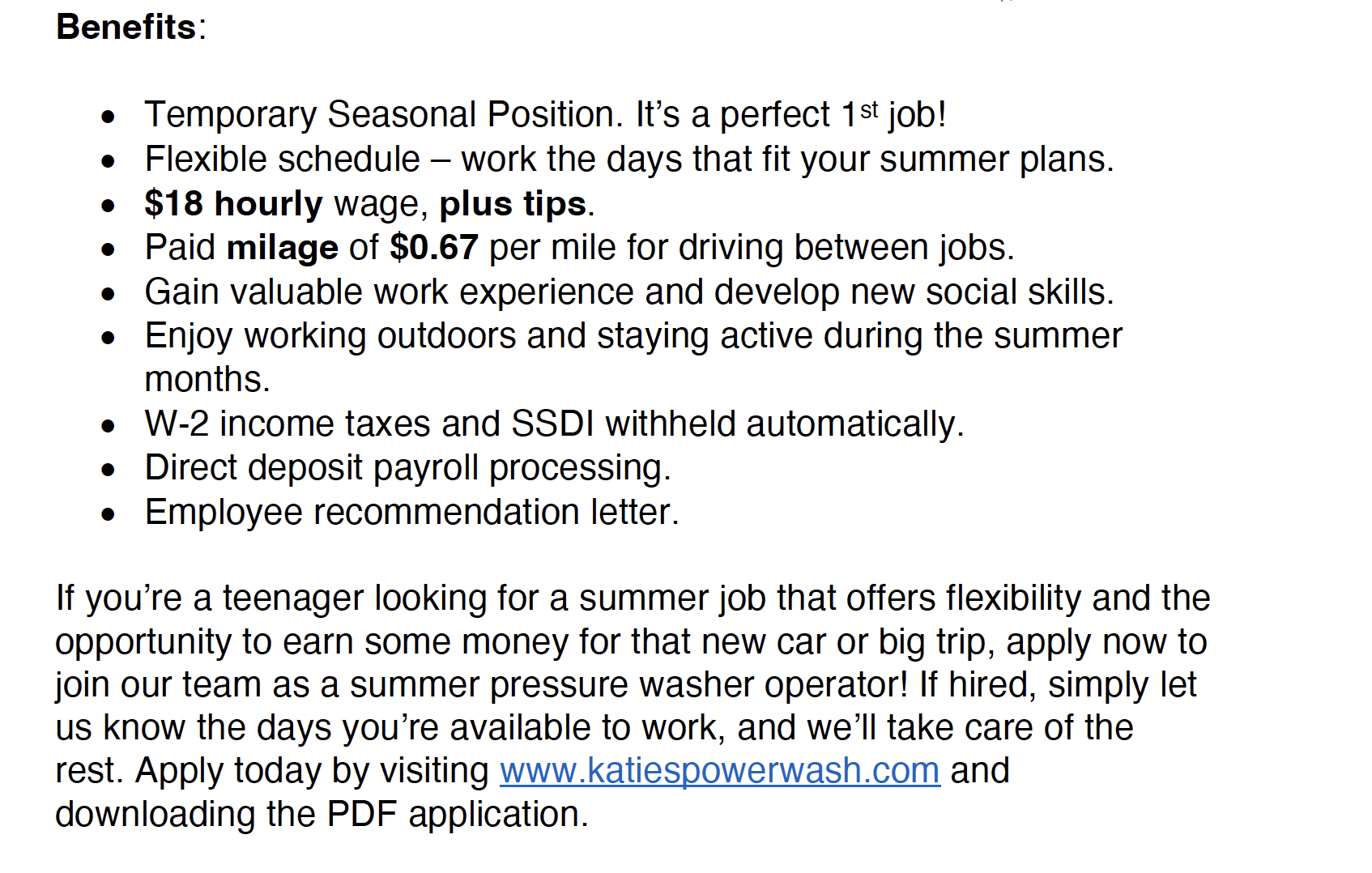 Apply today by downloading the PDF application. Fill it out with your information and include your availability by checking the days you can work this summer. Email your application to mcrossfield@katiescarpetcare.com